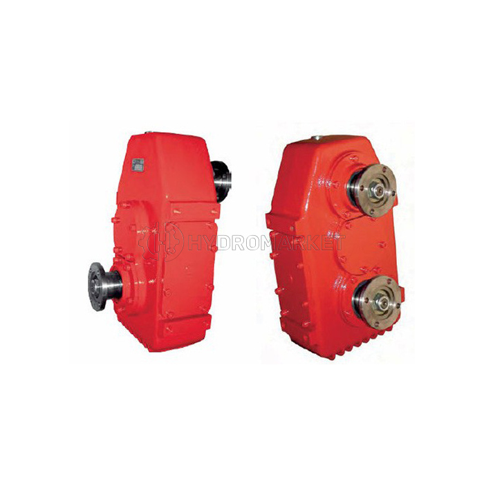 Reduksi dengan tiga poros vertikal. Masukan dari bawah, keluaran dari atas. Berbagai perbandingan internal.